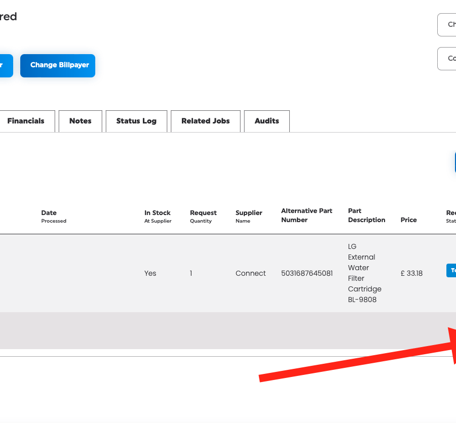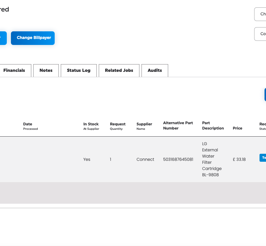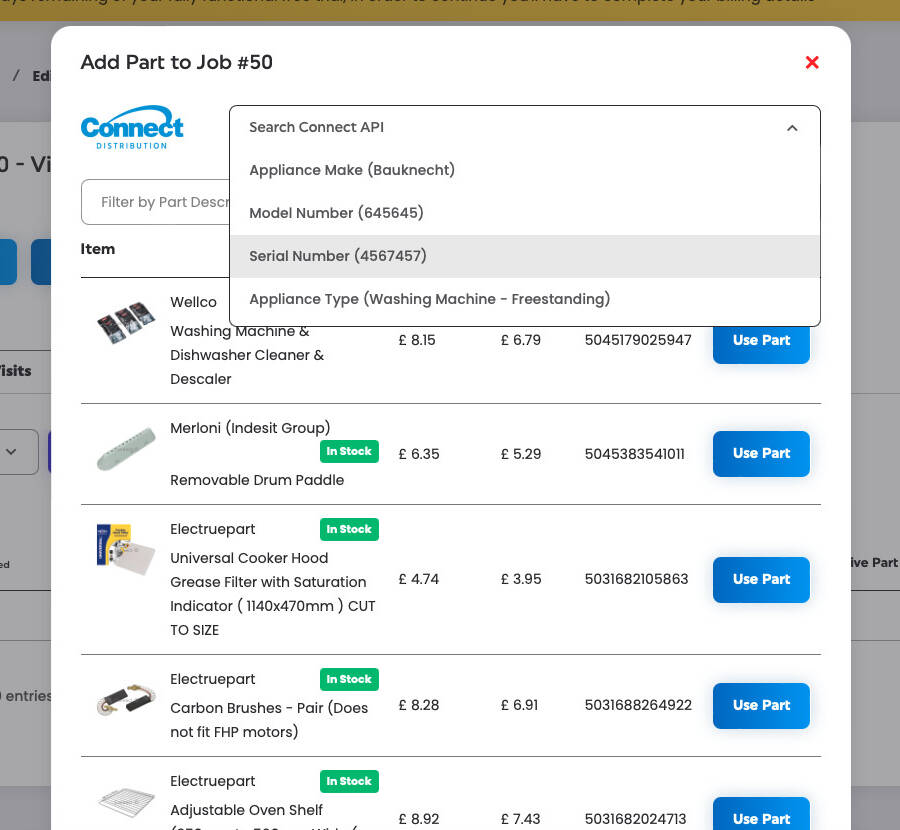As you enter the model number, Appliance Type, Serial number etc. Clicking the “Search Connect API” button will automatically search Connect for the appropriate parts needed. This is a great way to cut down on admin time either at the visit OR on the road! |